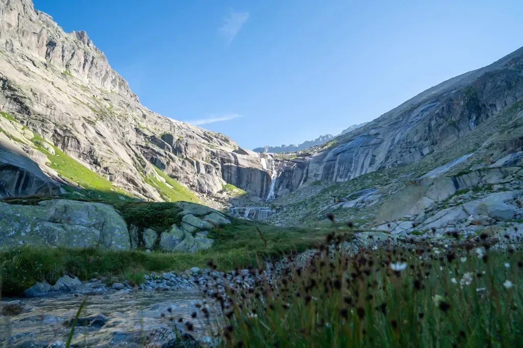 Aber nicht nur Wanderer, sondern auch Hochtourenfreunde steigen schwer beladen zur Gelmerhütte, um auf den Gletschern weiter oben den hohen Gipfeln entgegenzustreben. Kletterer toben sich derweil an den nahegelegenen Gelmerhörnern aus. Diese schroffen, ausgesetzten und steilen Felszähne erheben sich dreihundert Meter über den Wasserfällen, von wo aus die Alpinisten nur noch als bunte Punkte am gelb-grauen Fels ausgemacht werden können.