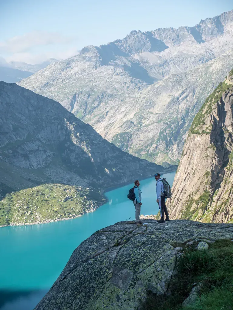 Bahn und Bus bringen Bergfreunde unkompliziert in die Jungfrau Region, genauer ins Haslital, südöstlich vom Brienzersee. Im Winter ist dieses Bergtal metertief eingeschneit. Im Sommer aber zeigt sich der kompakte Grimselgranit von seiner schönsten Seite. Hunderte Meter hohe Wände, über denen weiß die Gletscher hängen. Dazwischen glitzern gleich mehrere schillernde Seen, allesamt vor fast einhundert Jahren mit mächtigen Staumauern aufgestaut. Für den Bau des Gelmer Staudamms wurden damals schon Bahngleise in schwindelerregender Steilheit auf dem Granit verlegt – ein Bauwerk das heute noch faszinierte Blicke auf sich zieht.