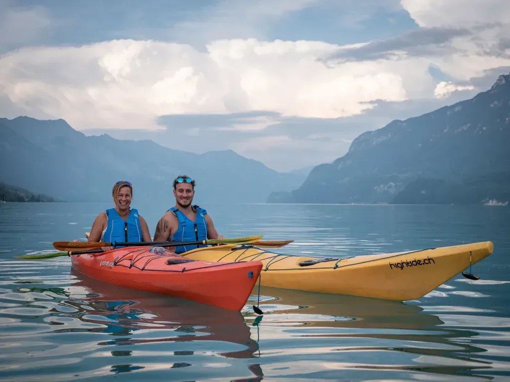 Keine zwei Stunden später: Was von oben noch in kräftigem Türkis leuchtete, schwappt nun erfrischend glucksend um die Waden. Der Brienzersee, das östliche der beiden Gewässer, ist weit mehr als 200 Meter tief – und ein Paradies für Kajakfahrer. Einmal mehr kommen die beiden Schwarzwälder hier mit der Multikultur der Region in Berührung. Ryan, der Kajak-Guide für die kommenden Stunden, ist Engländer, zwei weitere Tour-Teilnehmerinnen sind aus den Vereinigten Staaten angereist.