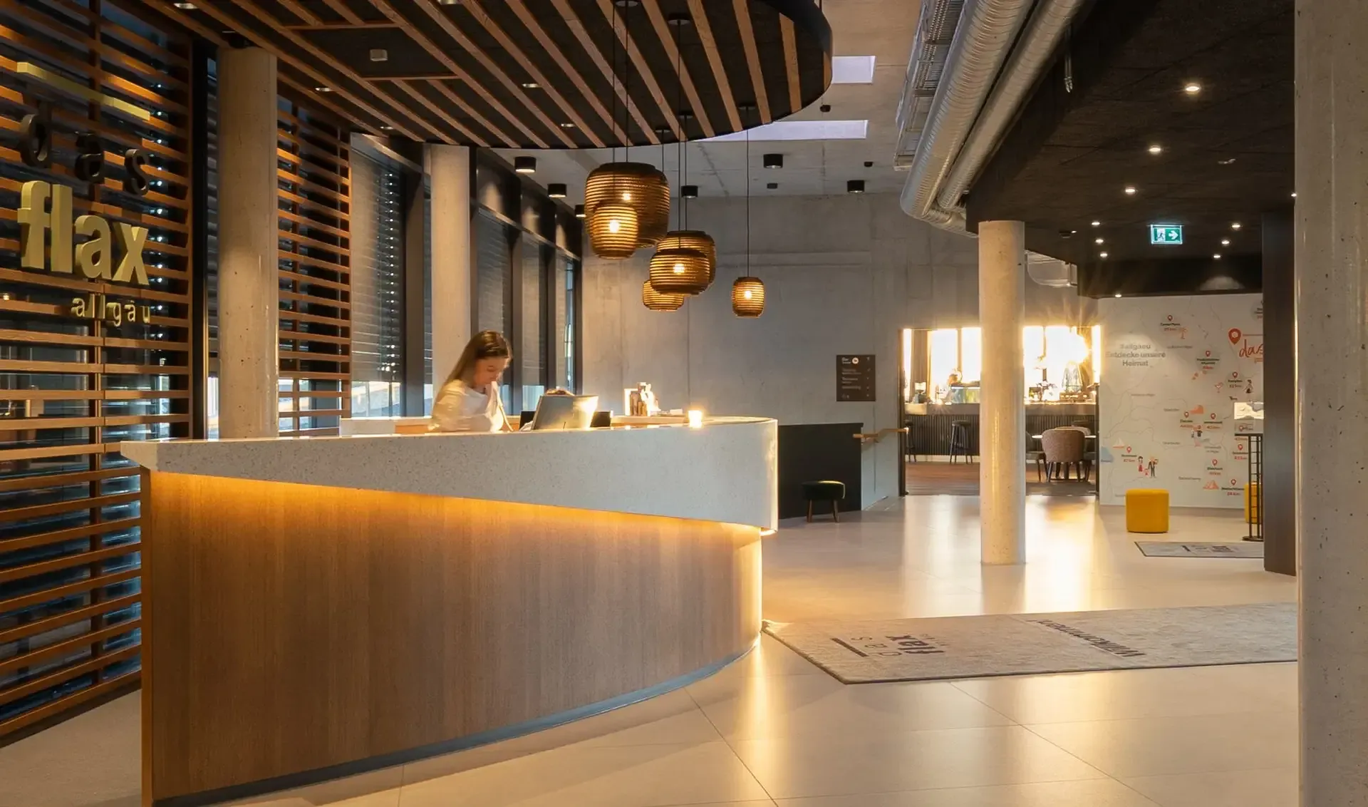 So sind die Gemeinschaftsbereiche großzügig-kommunikativ gestaltet, während die räumlich eher kleinen Zimmer mit ihrem warmen, reduzierten Design Ruhe und Weitsicht bieten. Mit 107 Zimmern und 6 Tagungsräumen, dem Festsaal, einem modernen Coworking Space und einem kleinen Wellness- und Fitnessbereich macht das flax allgäu all jene glücklich, die unterwegs gerne flexibel bleiben, neugierig auf die Umgebung sind und auch bei kleinem Budget nicht auf Stil und Qualität verzichten möchten. Zum Service gehören ein regionales Frühstück, eine 24/7 Rezeption sowie eine Bar. Zahlreiche Einkehrmöglichkeiten finden sich in nächster Nähe, darunter Cafés und Wirtshäuser, ein Bio Coffee Shop und vieles mehr.