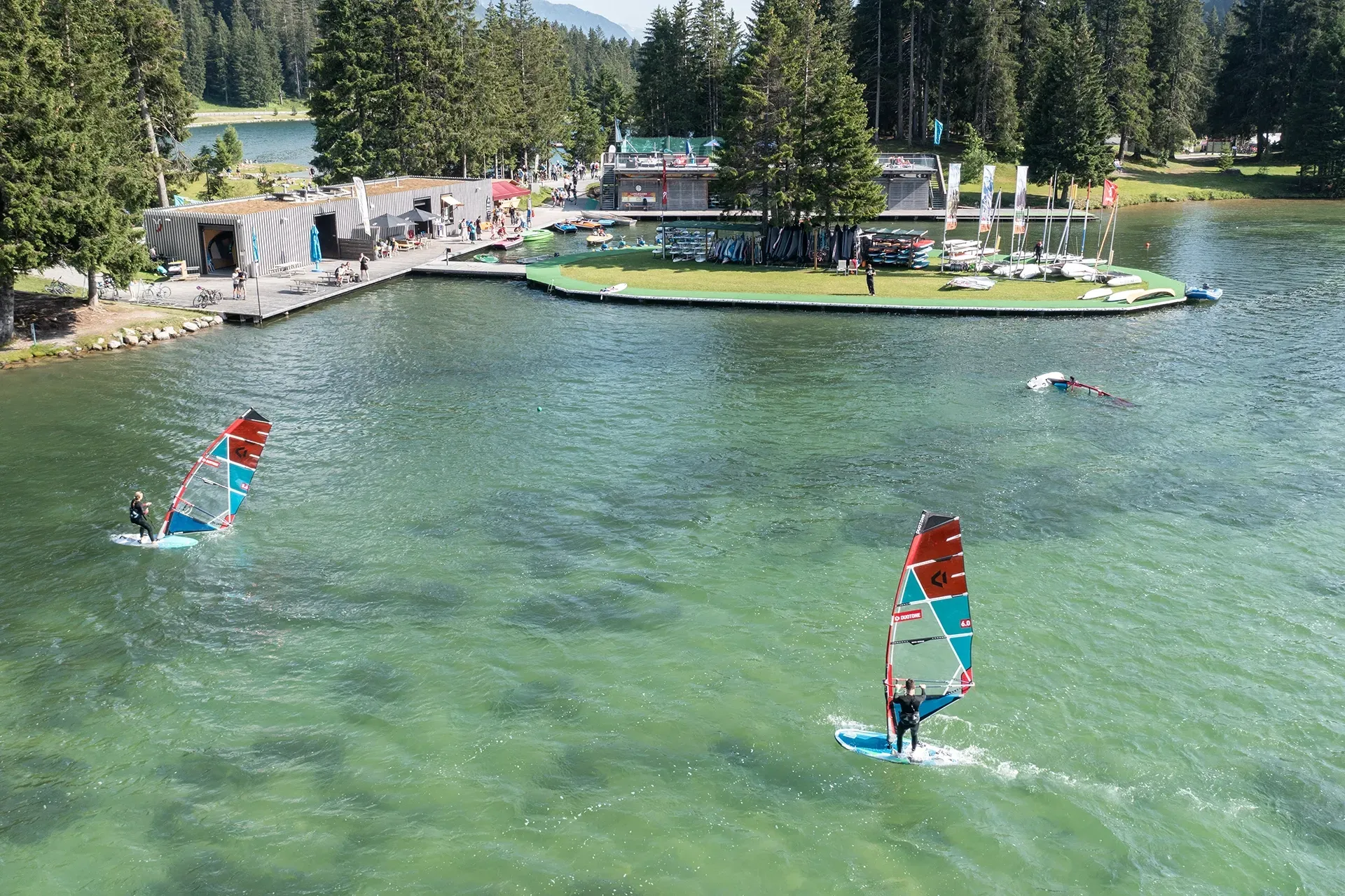 Wassersport: Perfekt für aktive Sommertage – der Heidsee bietet neben Badespass, auch Stand-up-Paddling, Tretbootfahren sowie das besondere Erlebnis des Windsurfens und Wingfoilens inmitten einer beeindruckenden Bergkulisse.