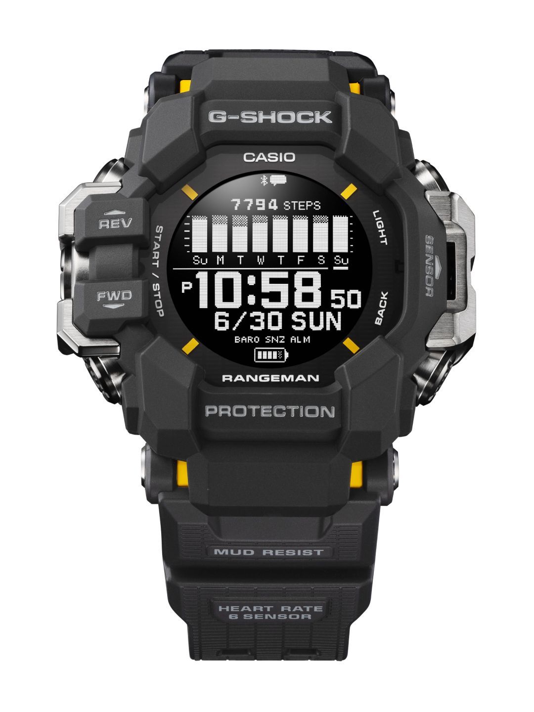 Die neue GPR-H1000 ist staub- und schmutzresistent und verfügt darüber hinaus über einen Beschleunigungsmesser für die Aufzeichnung von Aktivitäten, wie z. B. die Anzahl der zurückgelegten Schritte. Neben dem Kompass sind ein Gyroskop für die Streckenmessung und die Standortgenauigkeit und eine GPS-Funktionalität zur Erfassung von Standortdaten enthalten. Mit diesen umfassenden Messungen werden die Körperbewegungen des Trägers, Veränderungen der Umgebung und vieles mehr genau erfasst, so dass der Benutzer Bedingungen wie Herzfrequenz, Blutsauerstoffgehalt und Richtung auch in schwierigen Umgebungen exakt im Auge behalten kann.Die Master of G Linie wurde speziell für die Bedürfnisse von Profis konzipiert, die unter extremen Bedingungen leben oder arbeiten. Ob zu Lande, zu Wasser und in der Luft - die Tough Professional G-SHOCKs überzeugen mit Fähigkeiten und Funktionen, die speziell für jede dieser Umgebungen konfiguriert sind. So ist die RANGEMAN mit einem Dreifach-Sensor ausgestattet, der die Kompasspeilung, die Höhe/den Luftdruck und die Temperatur misst. Ideal geeignet für den optimalen Einsatz von Rangern und anderen Experten, die in den härtesten Landumgebungen arbeiten, wie zum Beispiel in heißen Regionen, trockenen Wüsten und felsigen Gebirgen.