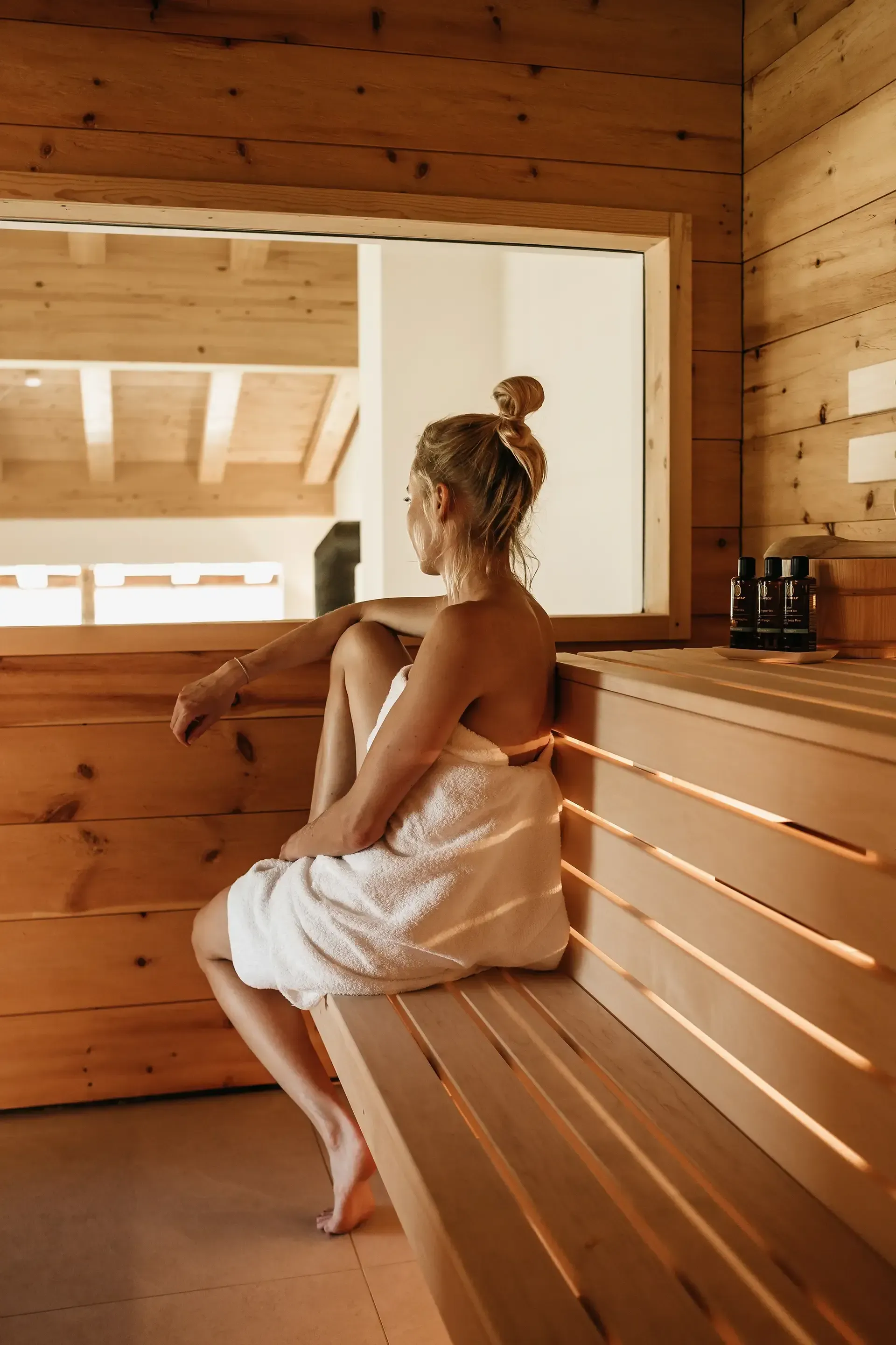 Jede Wohnung verfügt über eine private Sauna mit kleinem Ruhebereich, freistehender Badewanne und Freiluftbalkon. Zudem schwimmen Sie 365 Tage im Jahr im beheizten Infinity Pool mit frischem chlorfreien Bergquellwasser und Blick in die Berge.