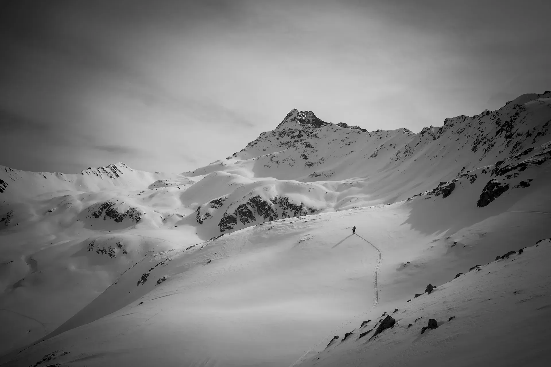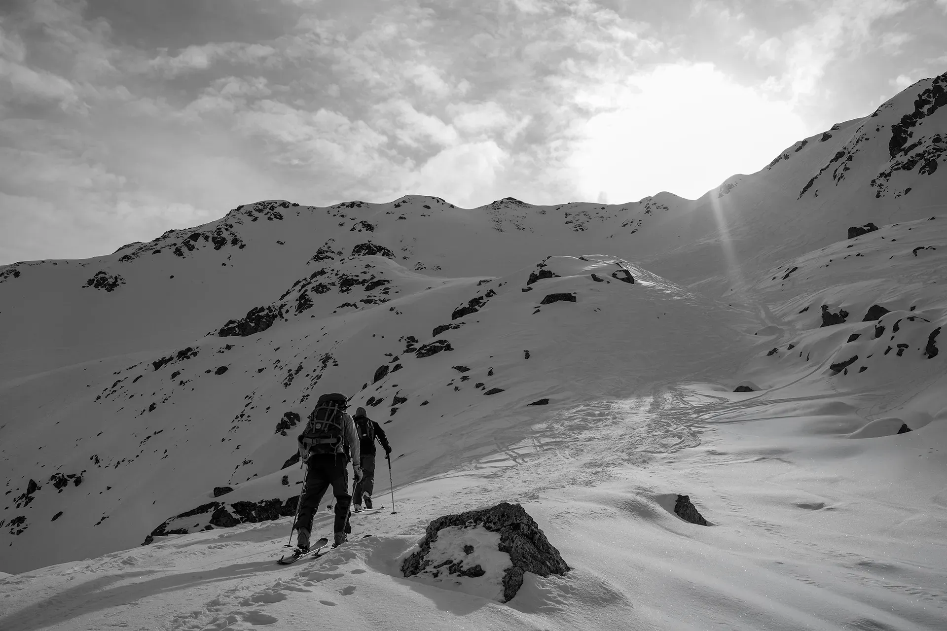 Die Hänge glitzern weiss – doch unser Ziel liegt höher. Abgelegener. Kälter. Echter. Mit jedem Schritt auf den Fellen wird das Atmen rhythmischer, das Denken leiser. Das LVS ersetzt das Sieb, die Tourenskier das Goldwaschbrett. Wie moderne Goldsucher steigen wir durch das winterliche Sertigtal bei Davos. Auf der Suche nach Pulverschnee und nach einem Moment, der alles wert ist.