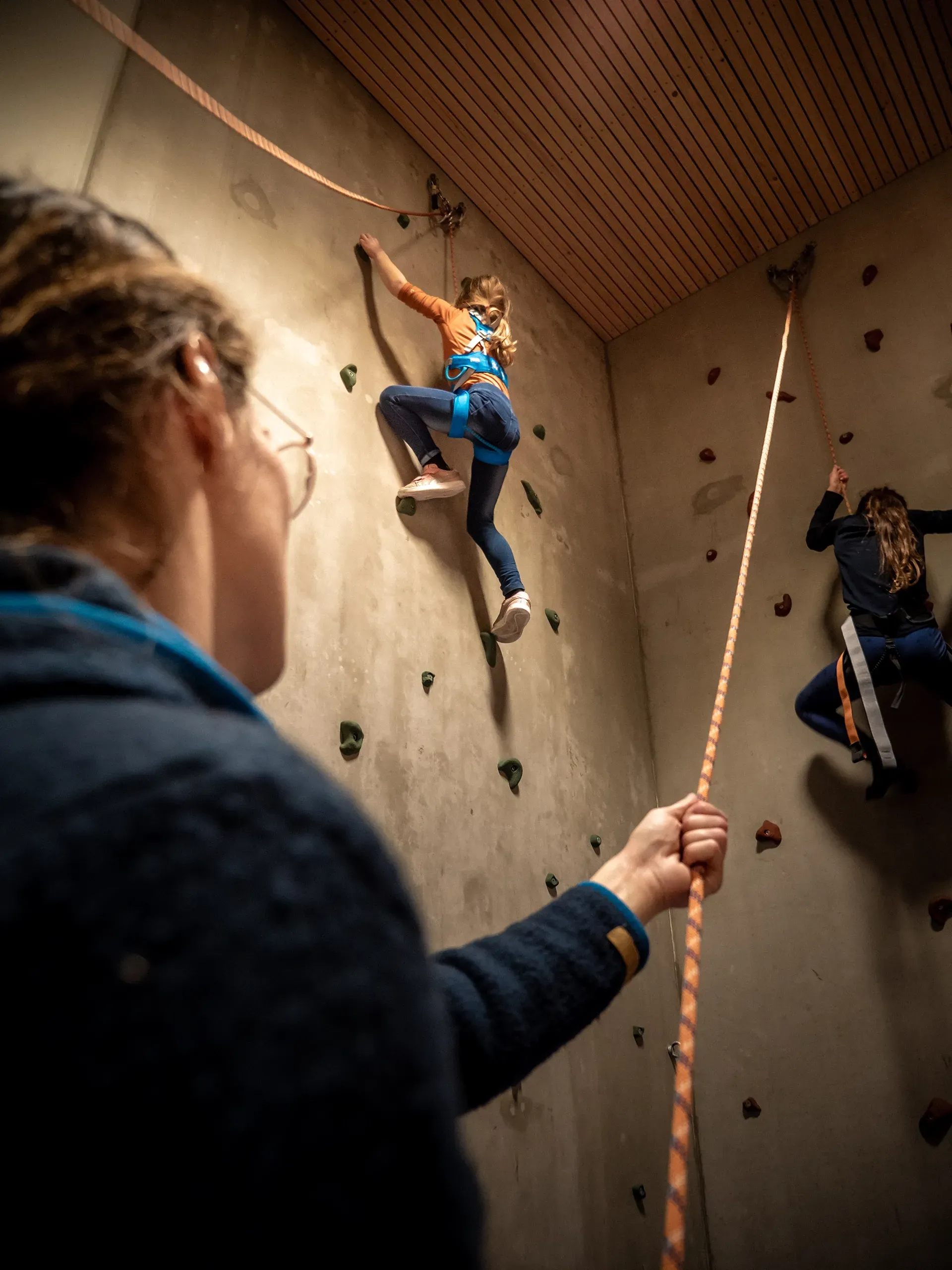 Peter ist nach dem Abendessen immer noch nicht müde und nimmt uns mit an die Kletterwand. Schnell zeigt er uns, wie man die Gurte anlegt. „Ziel ist es die Decke zu berühren“, lacht Peter. „Die Decke?“ Peter scheint das ernst zu meinen. Erst sichert er gewissenhaft meine große Schwester und dann mich.