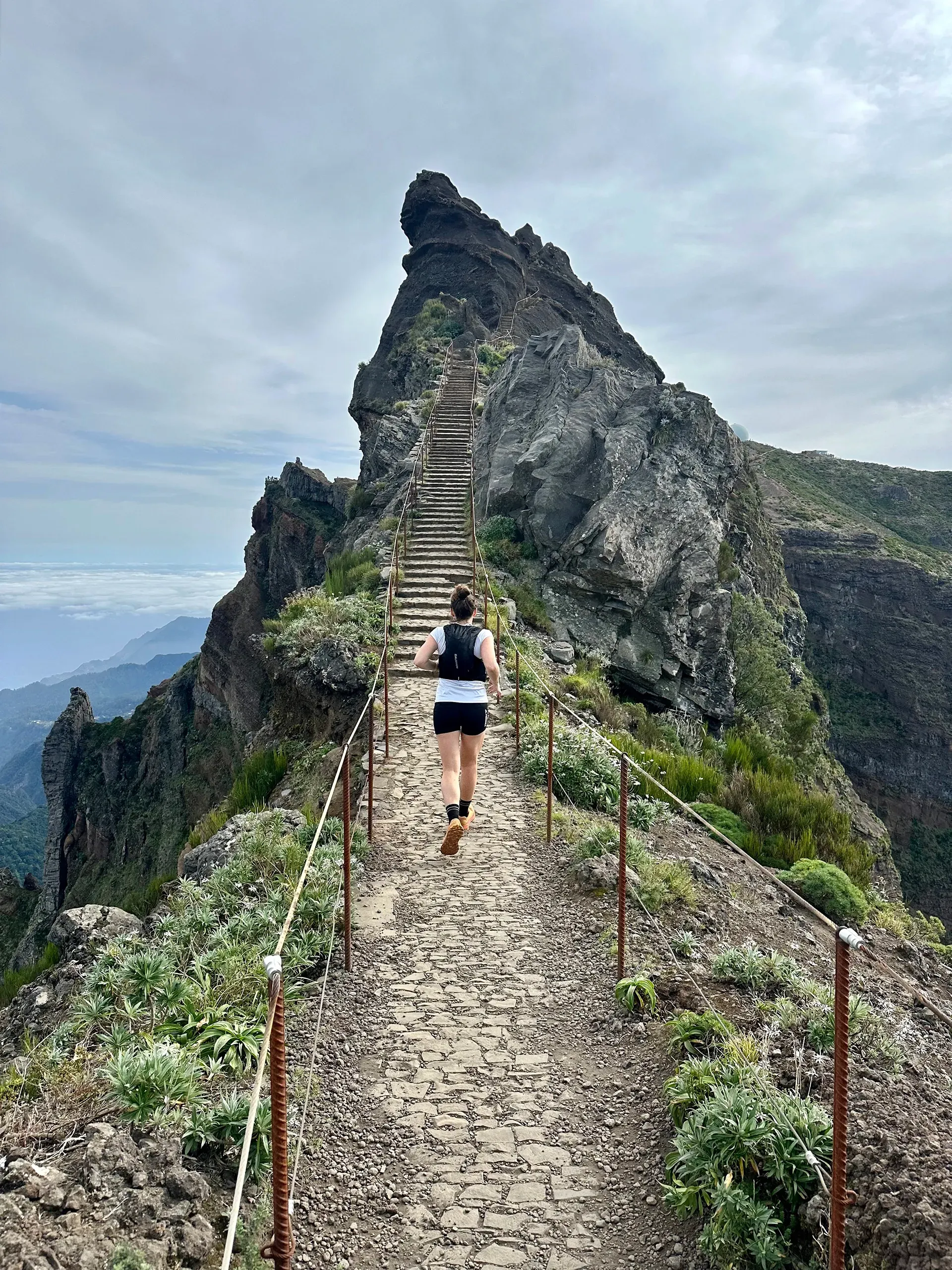 Auf den einfacheren Abschnitten gibt Sarina Technik-Tipps: Bergauf helfen kleine, gleichmäßige Schritte, begleitet von einem leicht nach vorne geneigtem Oberkörper und bewusstem Atmen. Beim Bergablaufen ist es wichtig, nicht zu bremsen oder nach hinten zu lehnen, sondern aufrecht zu bleiben und mit dem Vorfuß oder dem ganzen Fuß aufzusetzen. Besonders wichtig: der Blick. „Den Fokus immer ein paar Schritte nach vorne richten. So kann man frühzeitig erkennen, was kommt und schneller reagieren.“