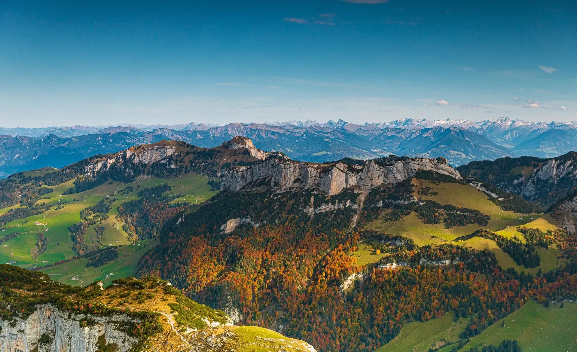 Vorbei an einer idyllischen Hügellandschaft und typischen Appenzeller Bauernhäusern geht es mit der Seilbahn vom Dorf Brülisau in nur acht Minuten gemütlich auf den Hohen Kasten. Wer lieber aktiv ist, gelangt mit einer knapp 2½-stündigen Wanderung auf den 1794 m hohen Gipfel. Oben angekommen, schweift der Blick über die sechs umliegenden Länder und fast 300 Berggipfel. Besonders genussvoll lässt sich das 360-Grad-Panorama im einzigen Drehrestaurant der Ostschweiz erleben.