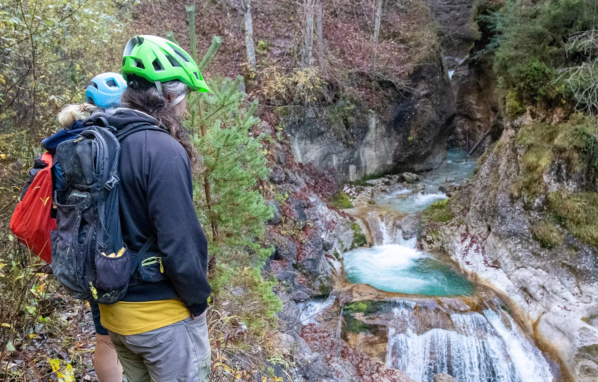Wieder zurück im Tal lotst uns Emil auf die offizielle „E-Bike-Genusstour“, die ihrem Namen alle Ehre macht, und bei der ausnahmsweise einmal nicht der Sport im Vordergrund steht. Die einfache Strecke mit 33 Kilometern und 330 Höhenmetern führt an zahlreichen Hofläden (Öffnungszeiten beachten!) und bei Bauern vorbei, die reichlich Rastmöglichkeiten bescheren. Sogar eine Imkerei, einen Alpakastall und die Destille von Siegfried Herzog kann man hoch zu E-Ross besuchen. Außerdem kann man sich an Selbstbedienungskühlschränken und -automaten mit lokalen Schmankerln (selbst-)versorgen. Wer, wie wir, die Tour verlängern möchte, findet zudem Ladestationen am Wegesrand, gemäß dem Motto des Tourismusverbands: „Volle Ladung für ein tolles E-Bike-Erlebnis“. Und deshalb brauchen wir uns keinen Akku-Stress zu machen, als wir für einen Side-Kick in das enge Tal des Stoissengraben nahe Saalfelden am Steinernen Meer einbiegen. Die türkisgrünen Gumpen des Buchweißenbachs laden im Hochsommer zum Baden ein. Jetzt, am Saisonende, begnügen wir uns mit einem Fotostopp, und staunen nicht schlecht über diesen wilden Canyon, ehe wir zur Einsiedelei hoch über Saalfelden weiterziehen, eine der letzten bewohnten Eremitagen Europas.