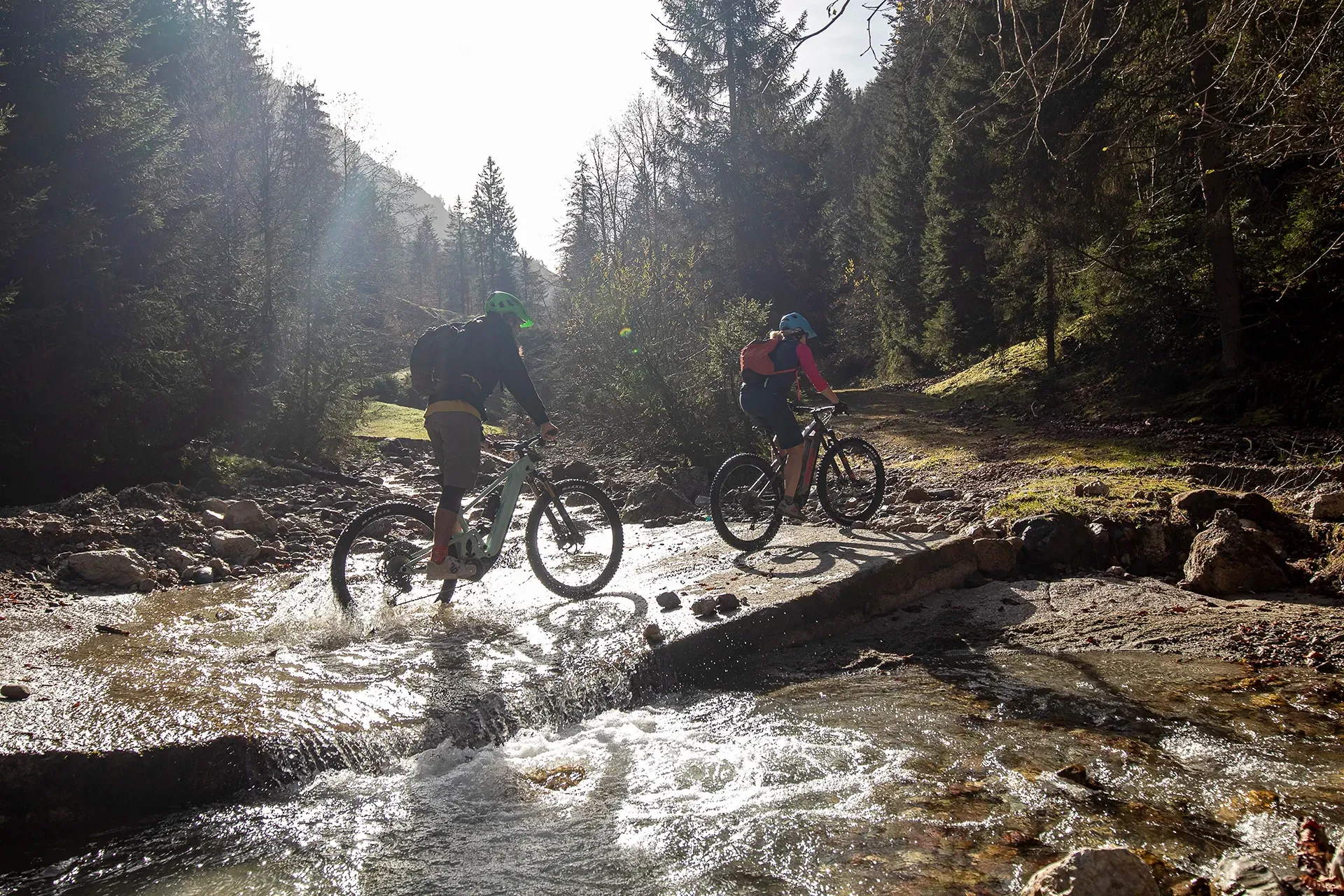 Bei der Rückfahrt über grüne Kuppen und durch tiefgrüne Wälder haben wir die Steinberge, diese schroffen Kalkriesen, abermals vor uns: Was für ein prächtiges Panorama! Und ganz ohne Puls am Anschlag! Wir bauen deshalb noch weitere Extra-Loops ein. Emil führt uns zum ehemaligen Badhaus und zeigt uns den Gunzi-Trail sowie ein verstecktes Moor, ehe wir im auf Radfahrer spezialisierten Biohotel Rupertus einchecken, wo bereits selbstgemachte Kuchen und der großzügige Außenpool auf uns warten.
