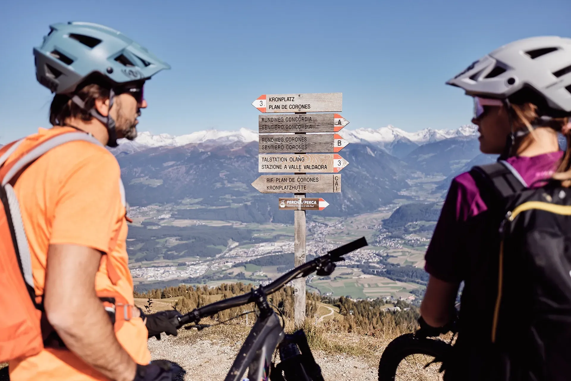 Der erste Weg für das bergsüchtige, gipfelhungrige und bikevorfreudige Herz führt in der Dolomitenregion unweigerlich auf den Gipfel des Kronplatz. Kaum angekommen, heißt es also rein in die Seilbahn und direkt rauf auf den Kronplatz – egal ob von Olang, Gassl, Reischach oder vom Furkelpass aus. Oben angekommen kann man tief ein- und ausatmen, den 360°-Blick über die Dolomiten schweifen lassen, alte Bekannte wie die Marmolata und die Drei Zinnen begrüßen und dann erst mal ins Museum gehen. Richtig gelesen! Wo das legendäre Messner Mountain Museum Corones und das LUMEN Fotografie-Museum schon für das richtige Mindset sorgen, stürzen wir uns gleich hinein ins Trailvergnügen. In Anbetracht der uns umgebenden legendären bleichen Berge des UNESCO Welterbe Dolomiten steckt man sich die Ziele gleich um ein Stück höher und die Kronplatz-Bike Bucket List ist schnell gefüllt! Aber nicht nur mit jeder Menge Adrenalin! Denn wo Südtiroler „WOW!“-Panorama auf mediterrane „MMH“-Kulinarik trifft, führen auch jede Menge Genuss-Mountainbike-Strecken zu unzähligen familiengeführten urigen Almhütten. Und auch das Kultur- & Kulinarikzentrum Bruneck für ein bisschen alpin-mediterranes Cityflair ist nur einen Katzensprung entfernt. Aber der Reihe nach…