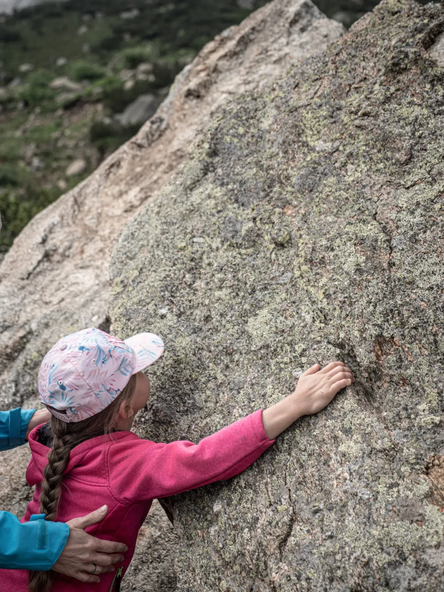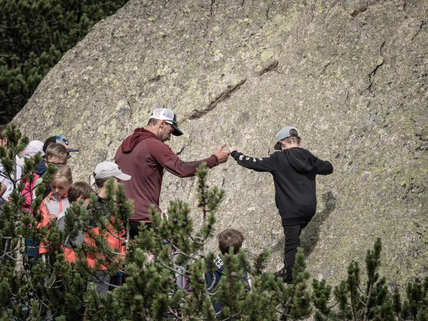 Und wer sich auf dem horizontalen Boulder-Pfad des Silvapark Galtür wohl fühlt, der kann gleich weiter in die Vertikale. Dort steht Bernd Zangerl nicht nur mit Rat und Tat zur Seite, sondern verteilt auch spannende Übungsaufgaben: Wer den Riss in der sanft nach hinten gelehnten Felswand durchstiegen hat, versucht es einfach mal ohne Hände. „Ohne Hände? Das geht doch gar nicht!“ Bernd aber machts vor – und siehe da: Die Kleinen treten in die Fußstapfen des Großen.
