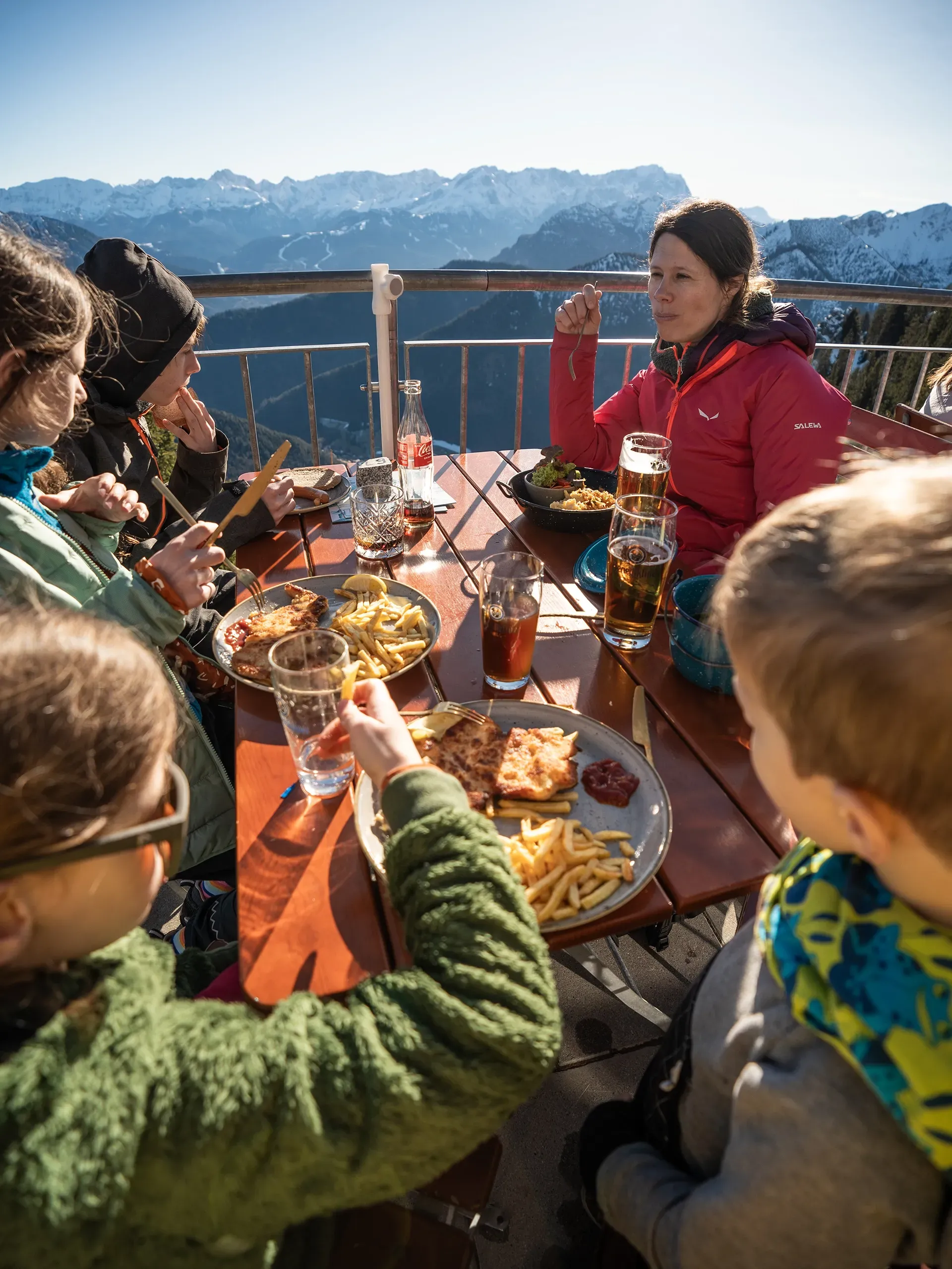 500 Höhenmeter später stecken wir in einer aussichtslosen Wolkendecke. Der Schnee aber liegt locker und pulvrig, verzaubert Wald und Wege in ein echtes Winterwunderland. Schnell ist das Vordere und Mittlere Hörnle erklommen. Beide bekreuzt, wie es sich für ordentliche Alpengipfel gehört. Berg Heil! Nach erfolgtem Gipfelsturm zieht uns der Hunger zurück zur Hörnlehütte. Leckerer Kaiserschmarrn für alle!
