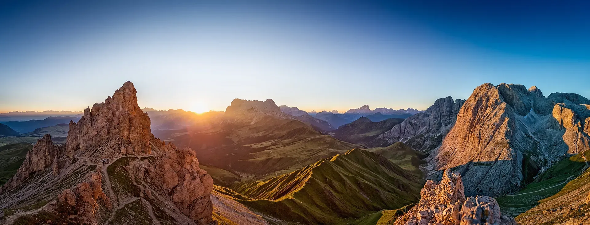 Früh aufstehen, Stirnlampe an und los: Nach und nach kämpft sich der Weg durch die Nacht. Plötzlich ändert der Himmel seine Farben. Sobald die Sonne die Gipfel der Dolomitenregion Seiser Alm in leuchtendes Gold taucht, sind die Mühen des Aufstiegs schnell vergessen. Geführte Sonnenaufgangstouren öffnen die Tür zu dies