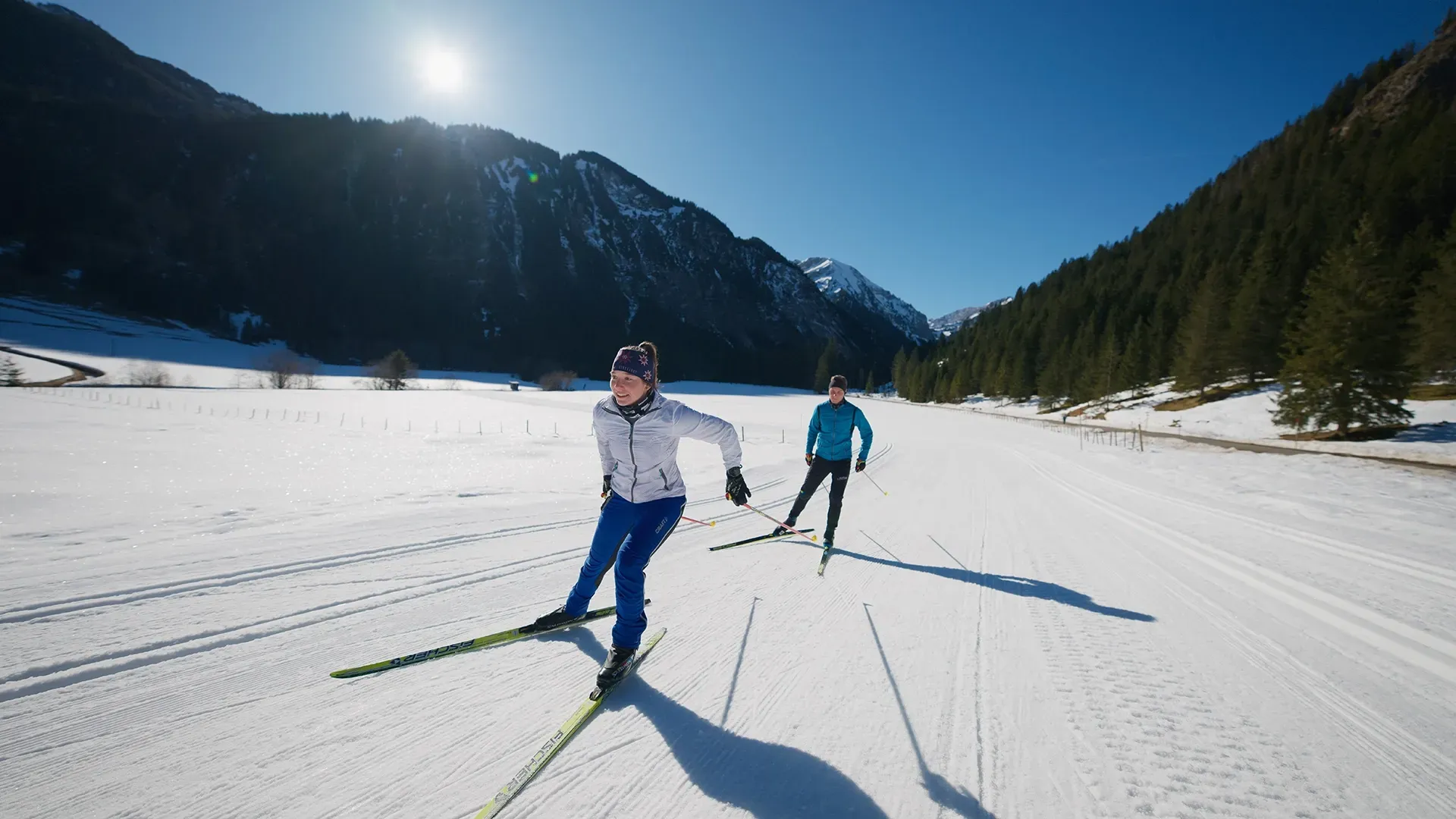 Unten im weiten Talboden wartet ein perfekt ausgebautes Netz aus 140 Kilometern gespurter Loipen. Ob klassisch oder Skating – das Loipennetz bietet Touren für jedes Niveau. Besonders beliebt: die Ski-Trail Runde, eine Loipe die durch das gesamte Tannheimer Tal bis ins benachbarte Allgäu führt und mit weiten Ausblicken auf die verschneiten Gipfel belohnt. Wer sportliche Ambitionen hat, wählt die Rundloipe Vilsalpsee, eine Strecke mit rhythmischem Profil und sonnigen Passagen, auf der man bestens ins Fließen kommt.