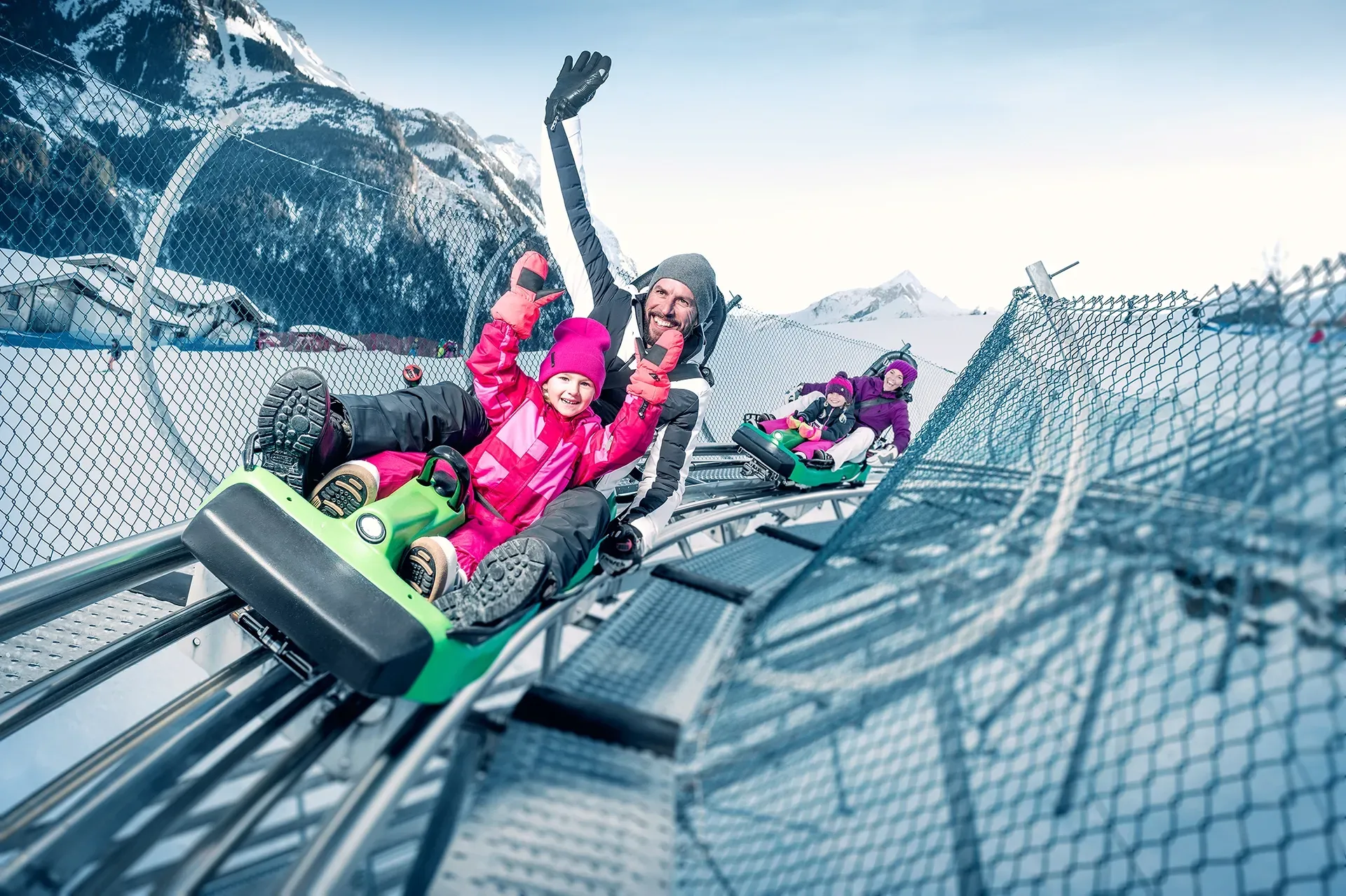 hochalpine Bergwelt. Von Jänner bis April tauchen Gäste im ICE CAMP presented by Audi auf 2.600 Metern in eine Wunderwelt aus Eis und Schnee ein. Für eine besonders rasante Talfahrt sorgt die Alpen-Achterbahn Maisi Flitzer gegenüber der Talstation im Kapruner Ortszentrum.